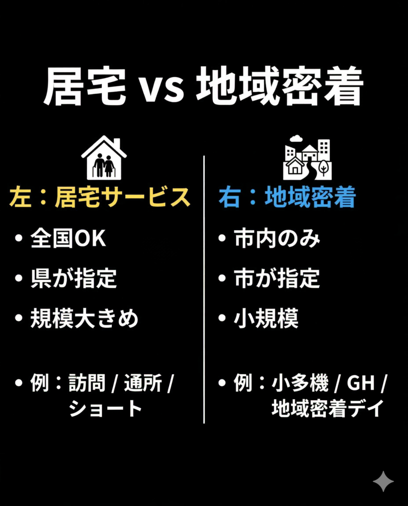 居宅サービスとの違い=「地域限定かどうか」で判断すると整理しやすいです。