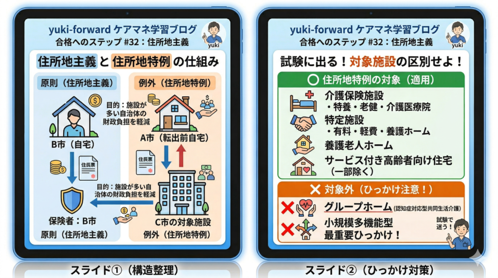 試験では「どの施設が住所地特例の対象か」がよく出ます。