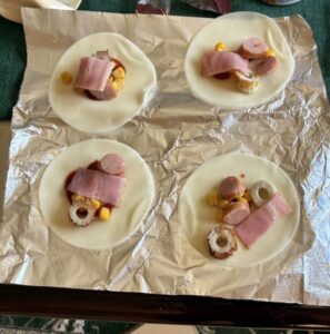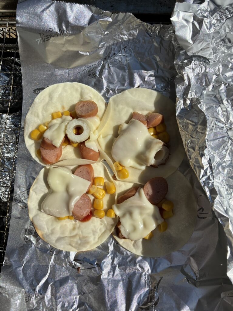 • トッピング: ちくわ、ウィンナー、コーン、チーズ。冷蔵庫のスタメンを子供たちが自由にのせていきます。特に「ちくわ」の塩気がチーズに合って大好評!