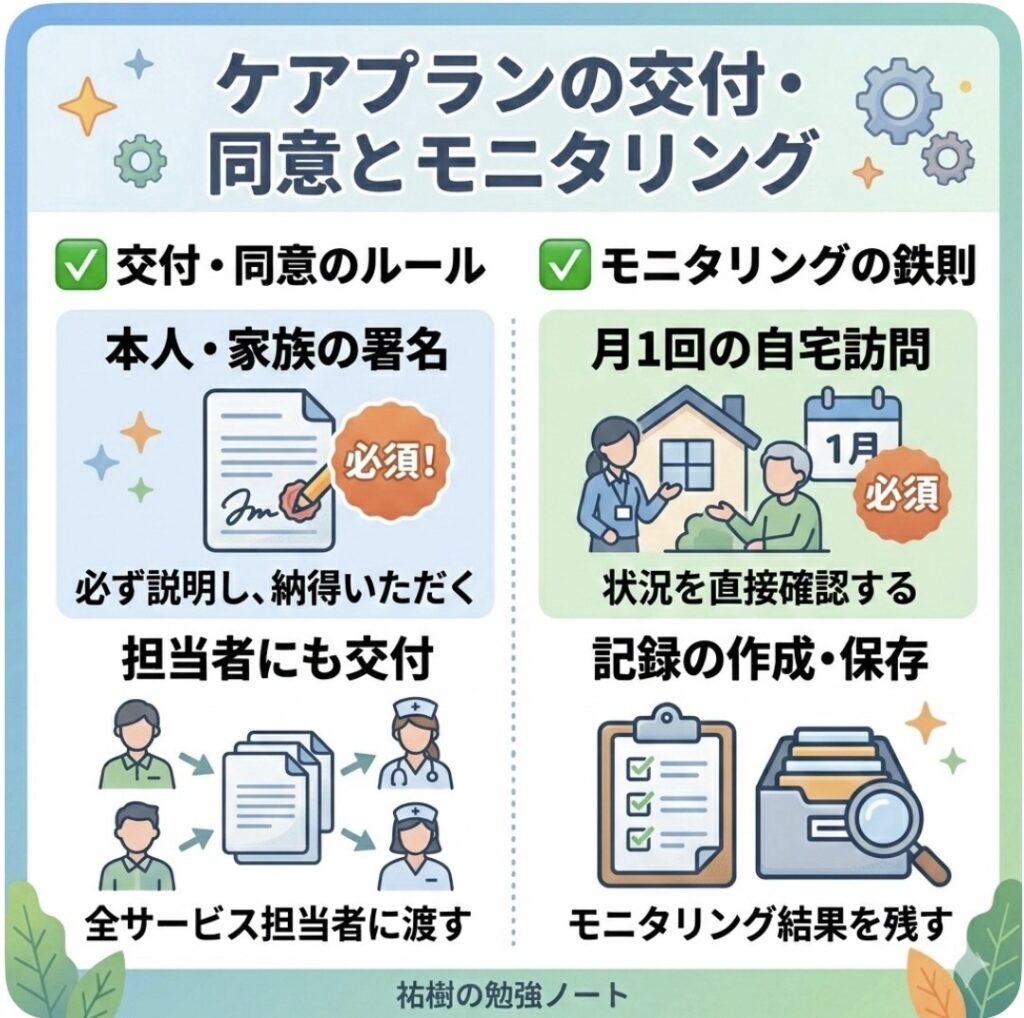 • 「担当者」を忘れない: どんなに本人への交付が完璧でも、担当者(ヘルパーや看護師など)にプランを渡していないのは、試験では大きな間違い(×)です。