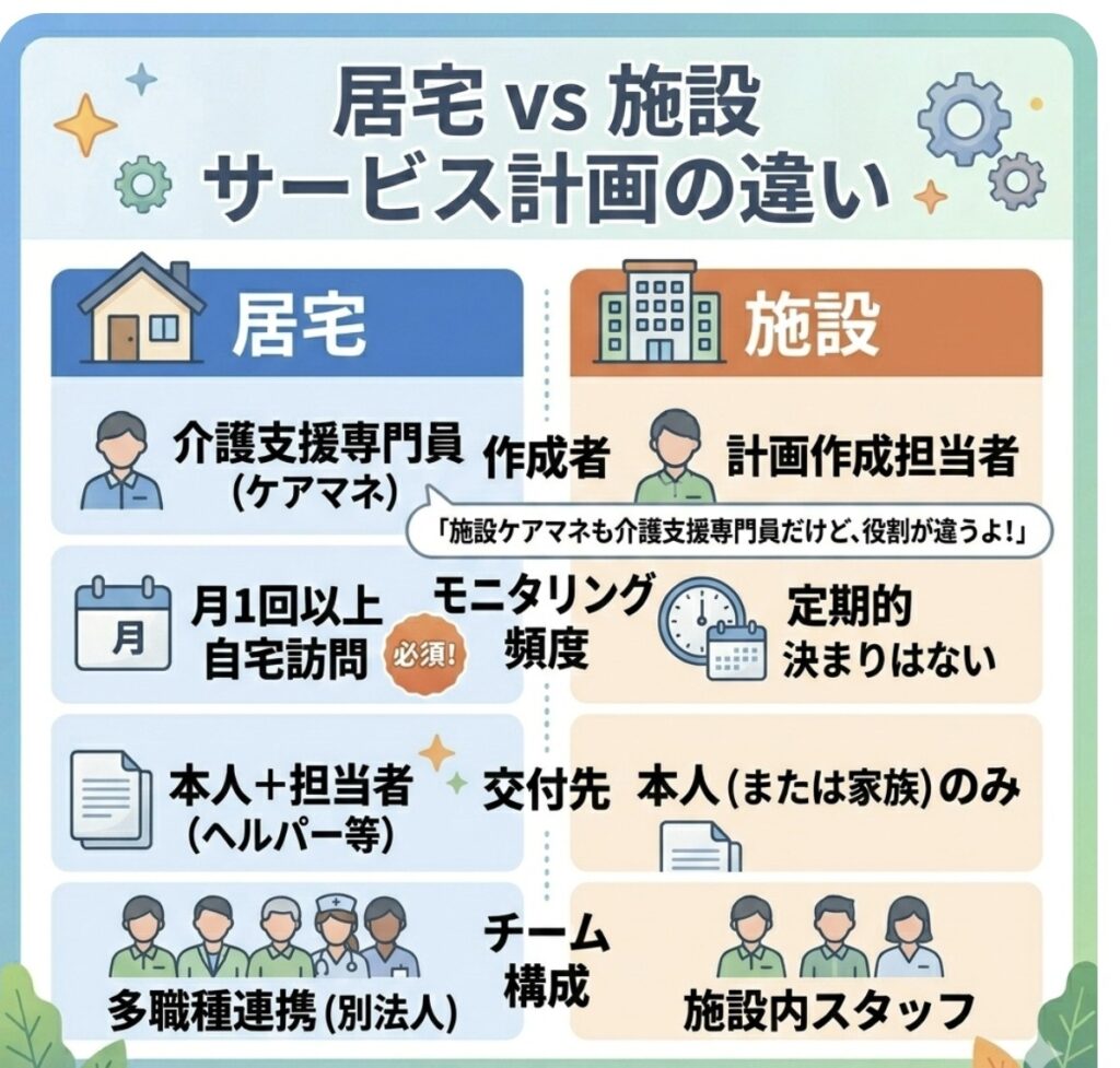 これまで「居宅(自宅)」のケアプランについて学んできましたが、試験では「施設」のルールとの入れ替え問題がよく出ます。 今のうちに、その違いをスッキリ整理しておきましょう!