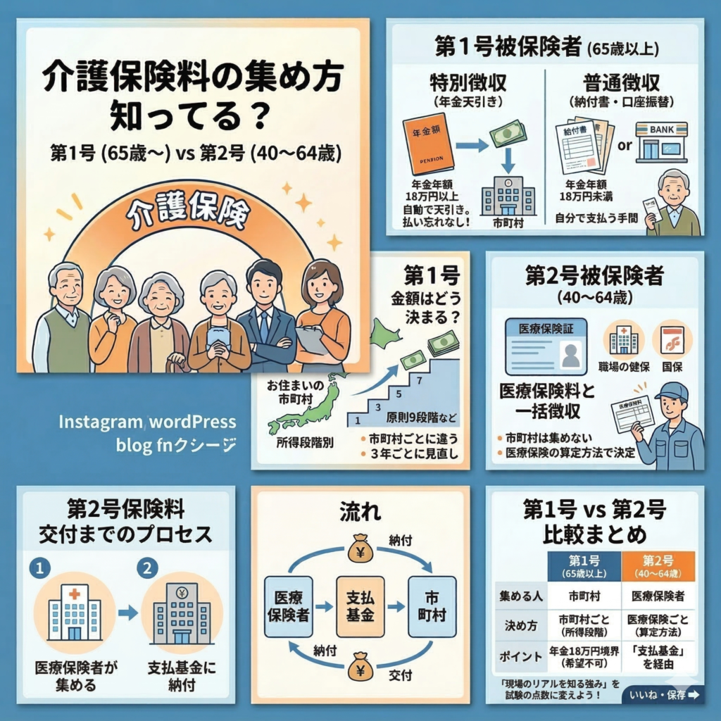 介護保険料は、第1号(65歳以上)と第2号(40〜64歳)で、集め方が全く異なります。ここが試験の大きな分かれ目です。
