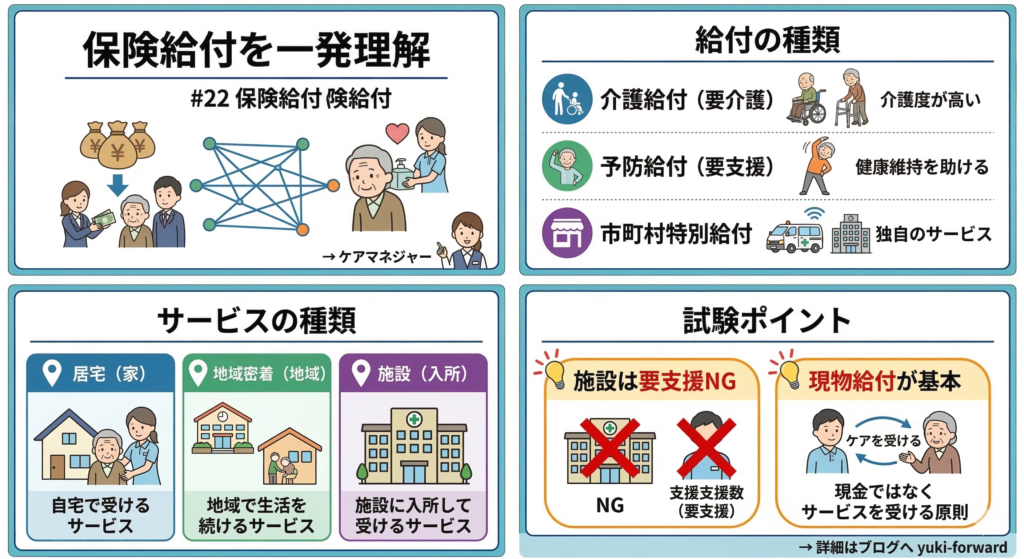- 給付の3分類:介護給付(要介護者)、予防給付(要支援者)、市町村特別給付(独自)。