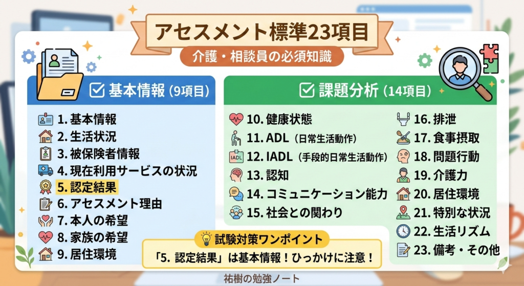• 「認定結果」の罠: 「第何号被保険者か」「要介護度はいくつか」などは、課題分析(10〜23)ではなく**基本情報(1〜9)**に含まれます。ここが一番のひっかけポイントです!